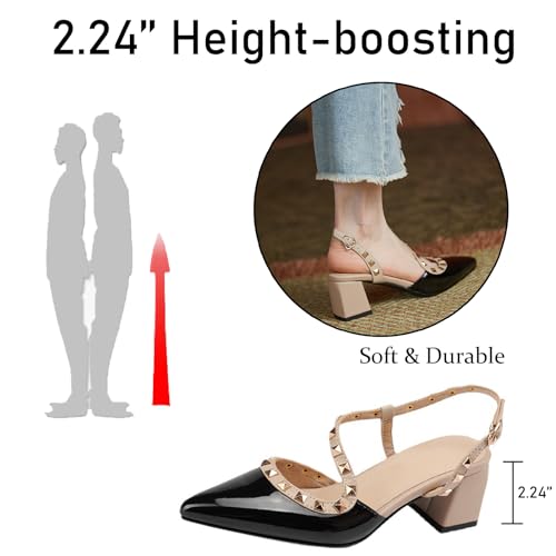 Women's Studded Leather Slingback Chunky Heels Pumps with Adjust Ankle Strap Sexy Closed Pointed Toe Mid Heel Mule Sandals Wedding Party Dress Shoes 2