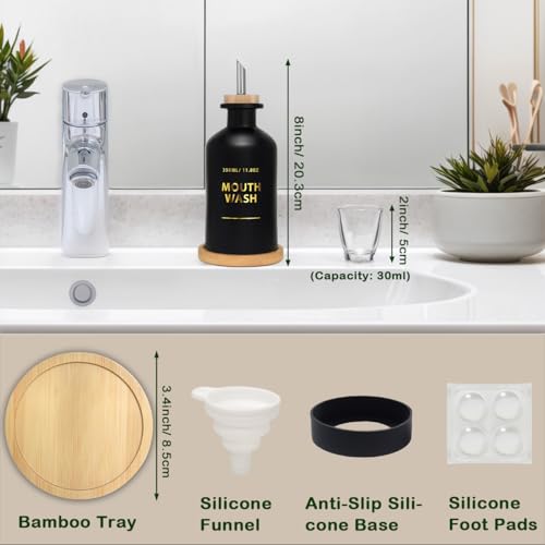 Mouthwash Dispenser for Bathroom 11.8oz – Glass Mouthwash Bottle with Cup & Bamboo Tray, Gold in-demand-Stamped Lettering, Silicone Base, up-to-date Bathroom Accessory (Black)