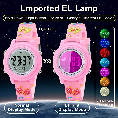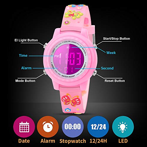 Kids Watch for Boys Girls Butterfly 3D Cute Cartoon Toddler Watch Digital Silicone Band Alarm Stopwatch Digital Child Wristwatch 50M Waterproof Pink 7
