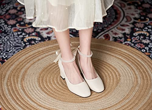 LizFoYa Women Elegant Square Toe Dress Pumps Ankle Strap Bow Accent Bridal Pumps Comfort Chunky Heels 4