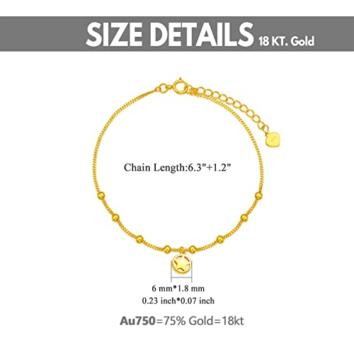 Material: Silver, Yellow GoldMetal type: Yellow GoldClasp type: Lobster ClawChain type: Box Chain, Link ChainGem type: Na-DESIGN - traditional 18kt gold Italian flat chain bracelet, linked with a dangling star, gold luster, a perfect gift for her. It adds more elegance to your looks.QUALITY MATERIAL - Real 18-karat gold, 75% pure gold, not just a covering of gold-plated. This is the most pure and sturdy form, with Au750 quality hallmark stamped. Won't tarnish, nickel free, and hypoallergenic.SPECIFICATIONS - Cuban Chain Length:6.5+1 adjustable extender, total length 7.5. Weight: 1.74g. This bracelet on the wrist is easy to put on, simply adjust them through chain extender. Simple but elegant.PERFECT GIFT FOR HER - This classic, timeless, and elegant jewelry ensemble is the perfect gift for mother, wife, sister or yourself on Mother's Day, anniversaries, weddings, engagements, parties, birthdays, or just to say I love you. Packaged in a premium gift box.GUARANTEE FOR YOU - A trusted Brand, 100% Easy Returns or Exchange policy If you have any questions with the purchase. Please feel free to contact us, 24-hour service. Perfect for everyday use. top-grade materials and excellent craftsmanship ensure long-lasting durability.