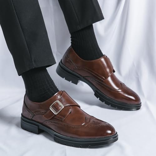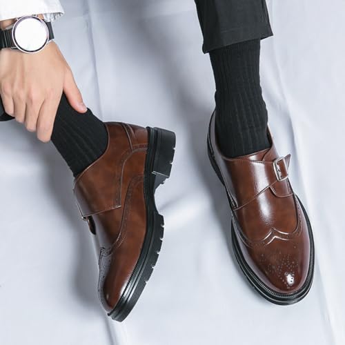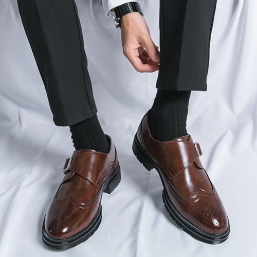 Men's Leather Single Monk Strap Wingtips Oxford Shoes Platform Round Toe Slip On Low Top Brogue Dress Shoes Formal Business Casual Loafers