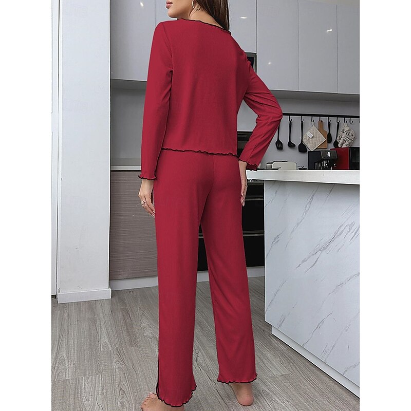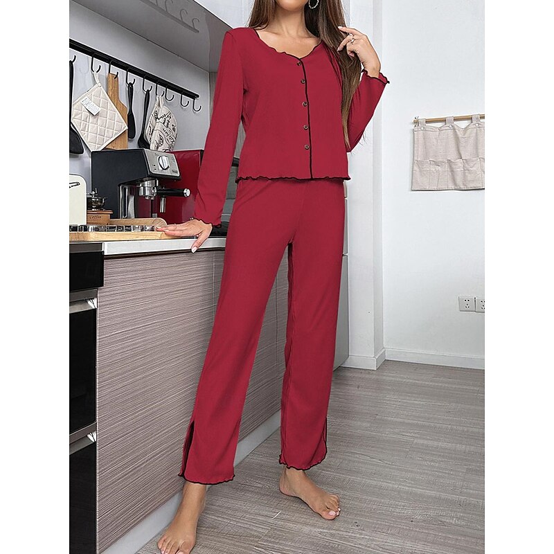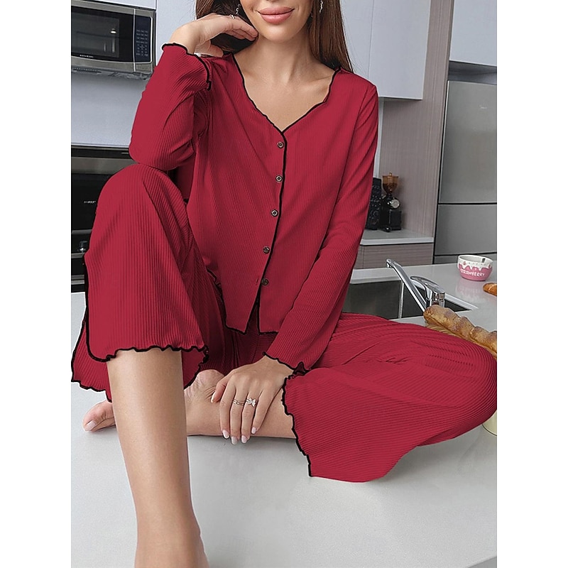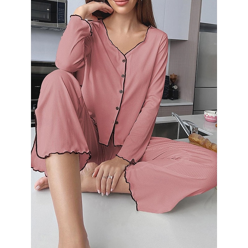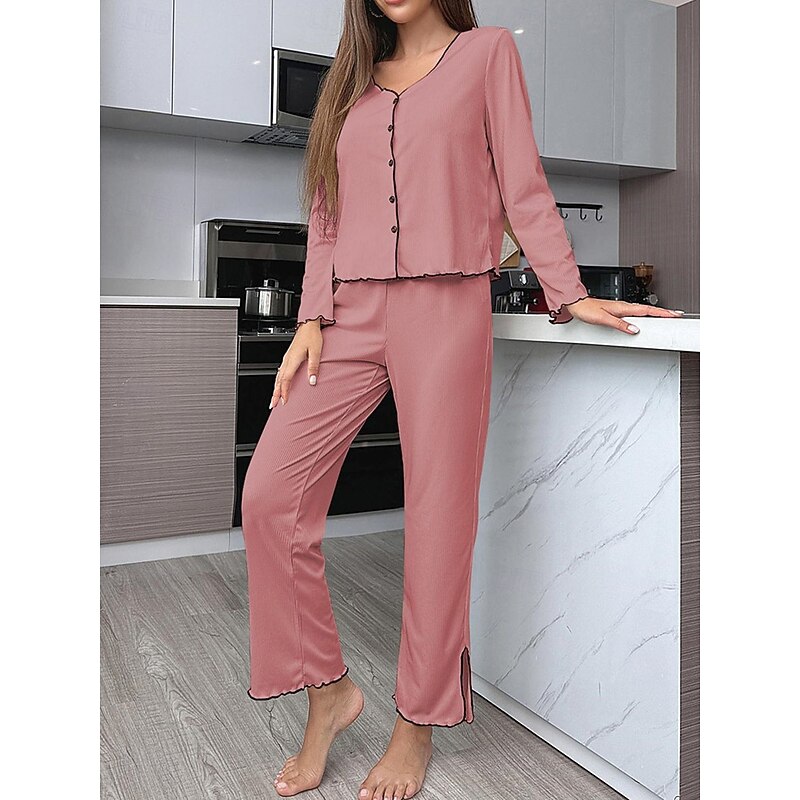 Highlights [Fabric] : Crafted from a high-quality polyester, this women's pajama set offers a perfect blend of warmth and breathability, making it suitable for both fall and winter seasons. The soft, ribbed fabric adds a touch of elegance and ensures a micro-elastic fit for optimal comfort. [Fit] : Featuring a relaxed and comfortable fit, this pajama set comes with a long-sleeved button-up top and wide-leg pants. The design allows for easy movement, making it perfect for lounging around the house. [Design Highlights] : The set boasts a sleek V-neckline with contrast piping along the edges, adding sophistication to the casual comfort attire. The matching contrast piping at the hem of the wide-leg pants presents a cohesive and polished look. An elastic waistband further enhances the ease of wear. [Occasions] : Ideal for daily home wear, this pajama set is perfect for any casual home environment. Whether you're relaxing on a chilly evening or enjoying a leisurely weekend morning, this set provides both style and comfort for your home attire needs. [Size Range] : Available in sizes S, M, L, and XL, this pajama set is designed to accommodate a range of body types, ensuring a comfortable and flattering fit for everyone. Perfect for everyday use. finest materials and excellent craftsmanship ensure long-lasting durability.