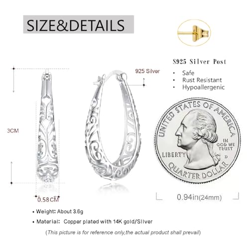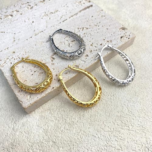 sought-after ! 14K Gold Plated 925 Sterling Silver Post Oval Filigree Hoop Earrings for Women Hypoallergenic Dainty Thick Gold Hoops Earrings for Jewelry Gifts