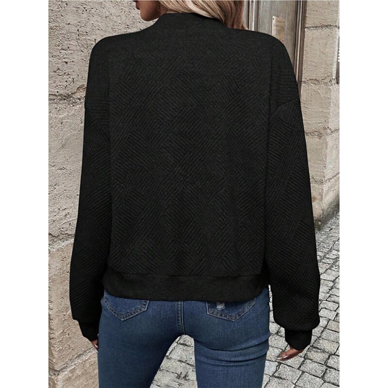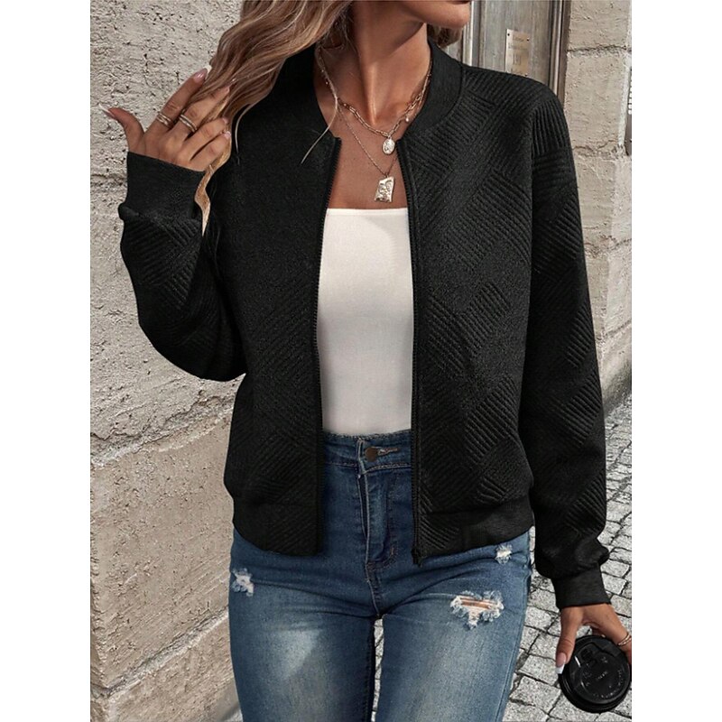 Highlights [Fabric] : Crafted from high-quality polyester, this women's casual jacket offers a micro-elastic texture that ensures both warmth and comfort during the fall and winter seasons. The breathable material also makes this piece windproof, perfect for outdoor activities. [Fit] : Designed with a regular fit, this jacket provides a sleek and contemporary silhouette that can easily be layered over any outfit, enhancing your casual style without compromising on comfort. [Design Highlights] : Featuring a chic, full-zip closure and a iconic crewneck, this jacket is adorned with a subtle geometric pattern that adds elegance to its plain surface. The ribbed collar and cuffs contribute to its sporty look, while the long sleeves provide additional warmth and coverage. [Occasions] : This versatile piece is ideal for everyday street wear, daily activities, and outdoor excursions. Whether heading out for a casual day or a sophisticated evening event, this jacket seamlessly combines practicality with style. [Size Range] : Available in sizes S, M, L, XL, and 2XL, this jacket caters to a variety of body shapes, ensuring a tailored and comfortable fit for every wearer. Perfect for everyday use. finest materials and excellent craftsmanship ensure long-lasting durability.