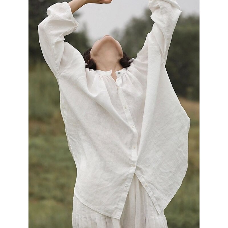 sought-after ! Women's Elegant Fashion Streetwear Cotton Linen Sets Long Sleeve Shirt Collar Plain Outdoor Work Casual White Summer Regular Fit
