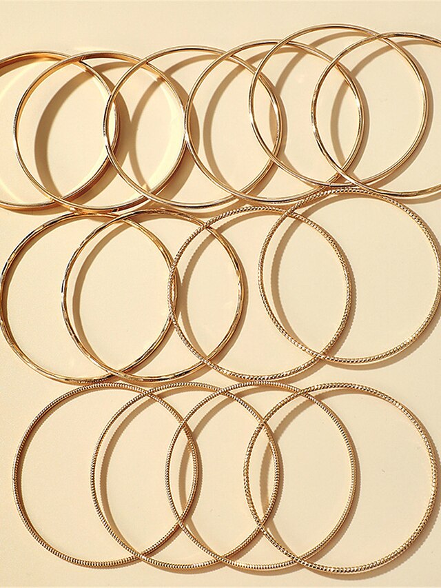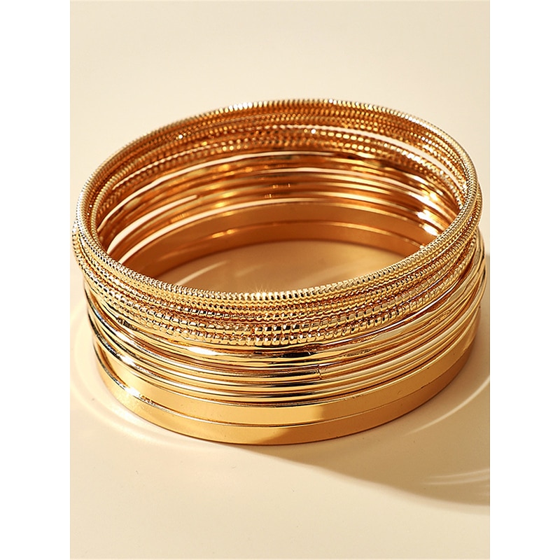 Highlights [Fabric and Material] : Crafted from high-quality alloy, these bangles boast a polished finish and gold-plated exterior that provides a shiny, reflective look, embodying both durability and elegance. [Design and Style] : The set includes a variety of designs, featuring a combination of smooth surfaces and textured detailing. This mix of simplicity and complexity offers an appealing layered effect when worn together, making these bangles a versatile addition to any outfit, whether contemporary, fashion-forward, or modern. [Design Highlights] : Each bangle is carefully designed to incorporate contemporary elements, such as varied widths and intricate textures, providing a balanced aesthetic. The polished finish accentuates the elegance and charm suitable for both casual and formal occasions. [Occasions] : These bangles are perfect for a variety of settings, from daily wear and street style to holidays, outdoor activities, and weekend park outings. The versatility of these bangles ensures they seamlessly complement any event, enhancing your ensemble with sophistication. [Size Notice] : Comes in a universal, one-size-fits-all design, accommodating a broad range of wrist sizes to ensure comfort and style for every wearer. Perfect for everyday use. excellent materials and excellent craftsmanship ensure long-lasting durability.