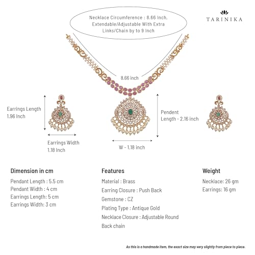 Item width: 16 centimetersMaterial: BrassMetal type: BrassClasp type: Fishhook ClaspGem type: Cubic ZirconiaPREMIUM MATERIAL & AUTHENTIC DESIGN: Experience the timeless charm of South Indian culture with this TARINIKA Antique Gold Plated Necklace and Earrings Set. Expertly crafted from gold-plated brass, this set features intricate floral motifs and is embellished with high-quality Cubic Zirconia (CZ) stones in a vibrant combination of white, red, and green.MEASUREMENTS & FEATURES: The necklace weighs 28 grams and has a length of 14 cm, while the matching earrings are 5 cm long with a weight of 16 grams. This set is designed to be lightweight and comfortable for prolonged wear, offering a contemporary statement piece that is easy to adorn.VERSATILE FOR ANY OCCASION: Elevate your traditional look with this stunning jewelry set. Perfect for weddings, festive celebrations, parties, and cultural events, its antique finish and colorful stones make it an ideal accessory to complement silk sarees, lehengas, or other ethnic attire. It can also be styled with a simpler outfit for a minimal yet chic look.IDEAL FOR GIFTING: This elegantly packaged necklace and earrings set makes a thoughtful and cherished gift. Whether it's for a birthday, anniversary, wedding, or Mother's Day, it's a perfect present for the special women in your life, symbolizing tradition, elegance, and beauty.JEWELRY CARE & LONGEVITY: To ensure the lasting beauty of your gold-plated jewelry, avoid direct contact with perfumes, hairsprays, and other chemicals. Store the set in its original box or a zip-lock bag in a cool, dry place away from direct sunlight and moisture to prevent tarnishing and maintain its radiant shine.BRAND & WARRANTY: TARINIKA is a leading brand in high-quality traditional Indian jewelry. This product comes with a 1-year manufacturer's warranty covering standard repairs and maintenance, providing you with confidence and peace of mind in your purchase. Perfect for everyday use. excellent materials and excellent craftsmanship ensure long-lasting durability.