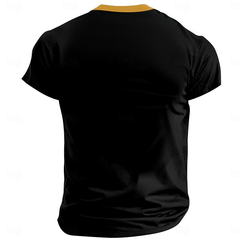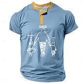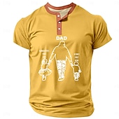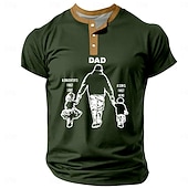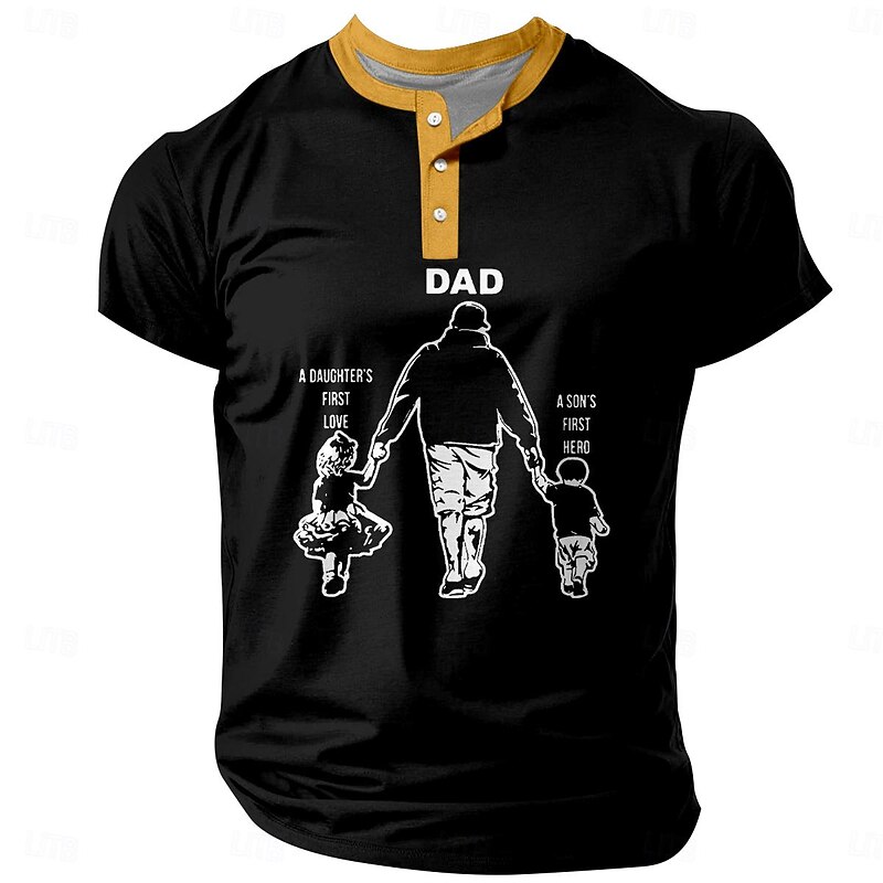 The shirt features a striking 3D printed graphic on the front, showcasing a heartfelt depiction of a father holding hands with his children. The neckline is a special Henley style with a distinctive button closure, accented by a contrasting red trim that adds a dash of character to the overall look. Available in a range of vibrant colors such as Green, Black, Sky Blue, Navy Blue, and Yellow, this t-shirt exudes both charisma and sentiment.