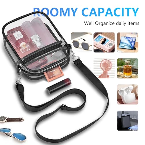 • [Clear Bag for Stadium Events] clear crossbody bag Size 7.8"H x 5.9"L x 2.1"W, complies with the clear bag policy of no larger than 12*12*6 inches, for public safety, more and more public places begin to implement clear bags policies across the country, can easily and quickly go through security lines, suitable for stadiums, concerts and sporting events.