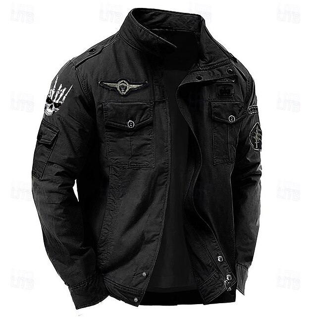 sought-after ! Men's Cotton Embroidered Military Jacket Windbreaker with Shoulder Straps Long Sleeve Standing Collar Multi-Pockets Trucker Jacket Skull Skeleton Print Tactical Outerwear