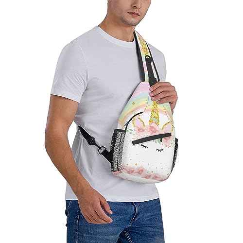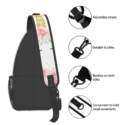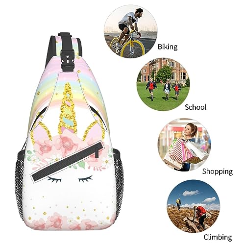 Pink Glitter Flowers Unicorn Sling Bag Crossbody Backpack for Women Men Hiking Travel Over the Shoulder Daypack Casual One Strap Pack Lightweight Cross Chest Bag Purse Outdoor Cycling