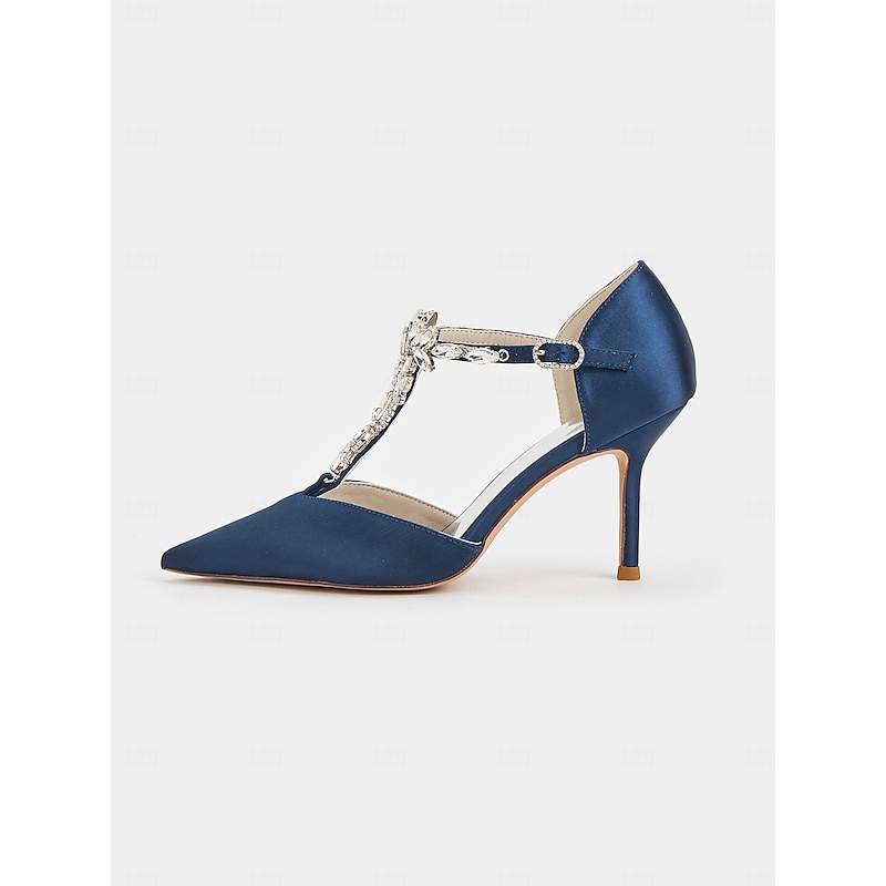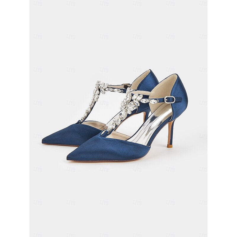 Women's Navy Blue Satin T-Strap Heels – Pointed Toe Cocktail Shoes with Crystal Embellishments for Wedding and Evening Parties