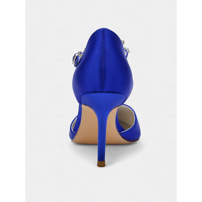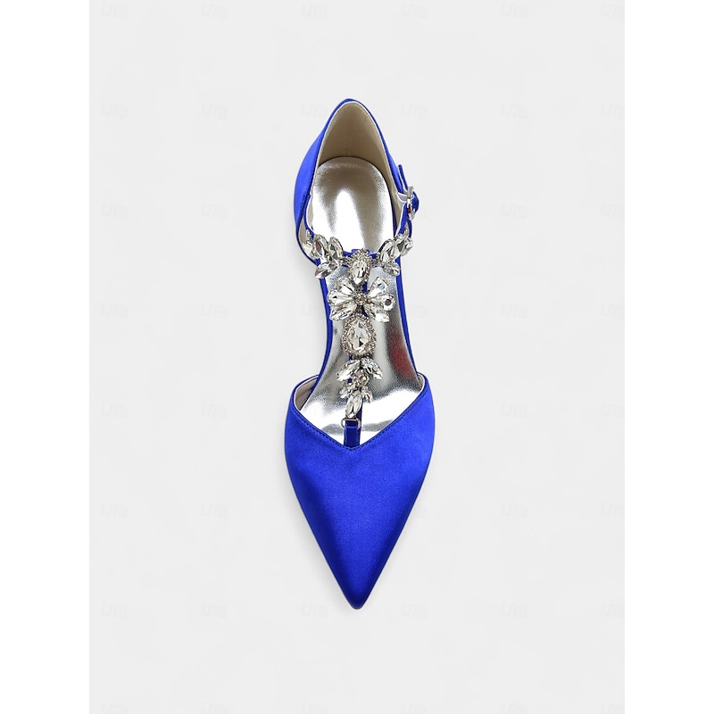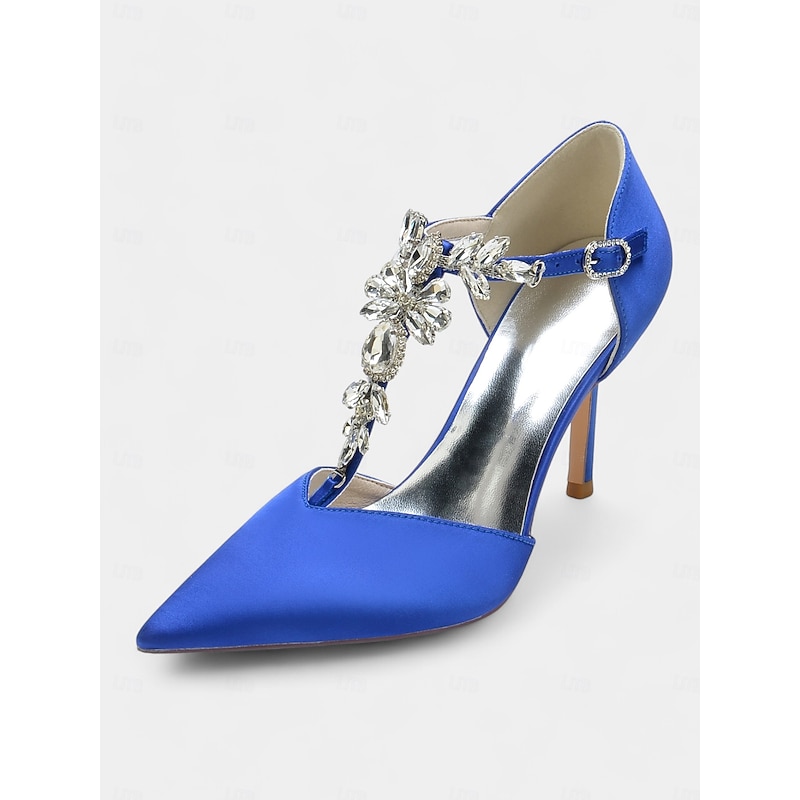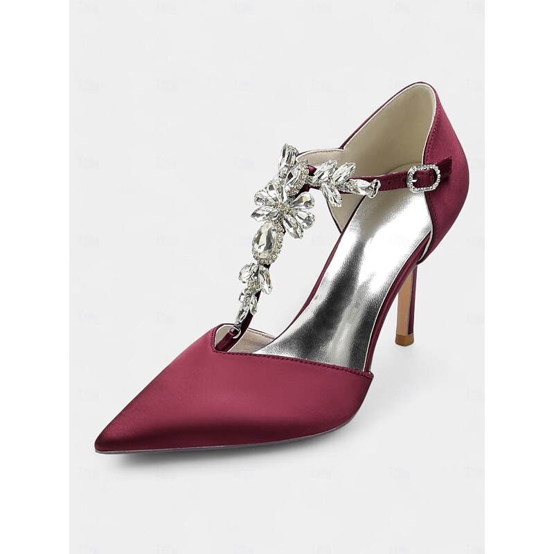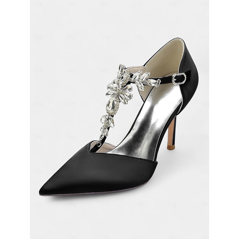 : Crafted from luxurious satin, these women's heels are the epitome of elegance and style. Designed with a sharply pointed toe, they present a sleek and contemporary silhouette, flawless for catching eyes at any event. The standout feature is the embellished T-strap, adorned with dazzling rhinestone ornaments that add a touch of glamour to the overall look.