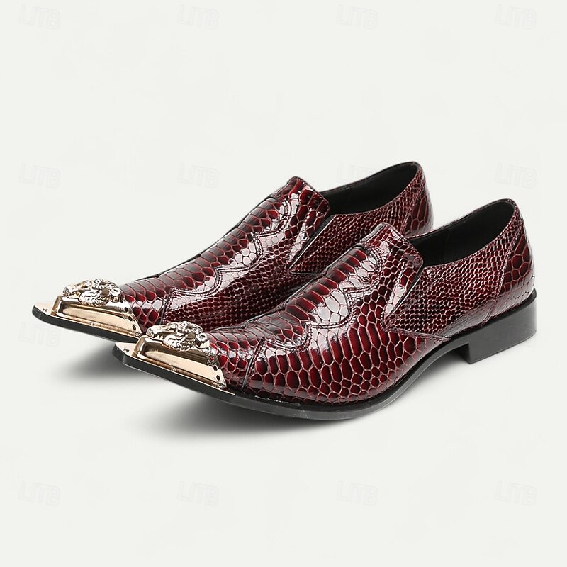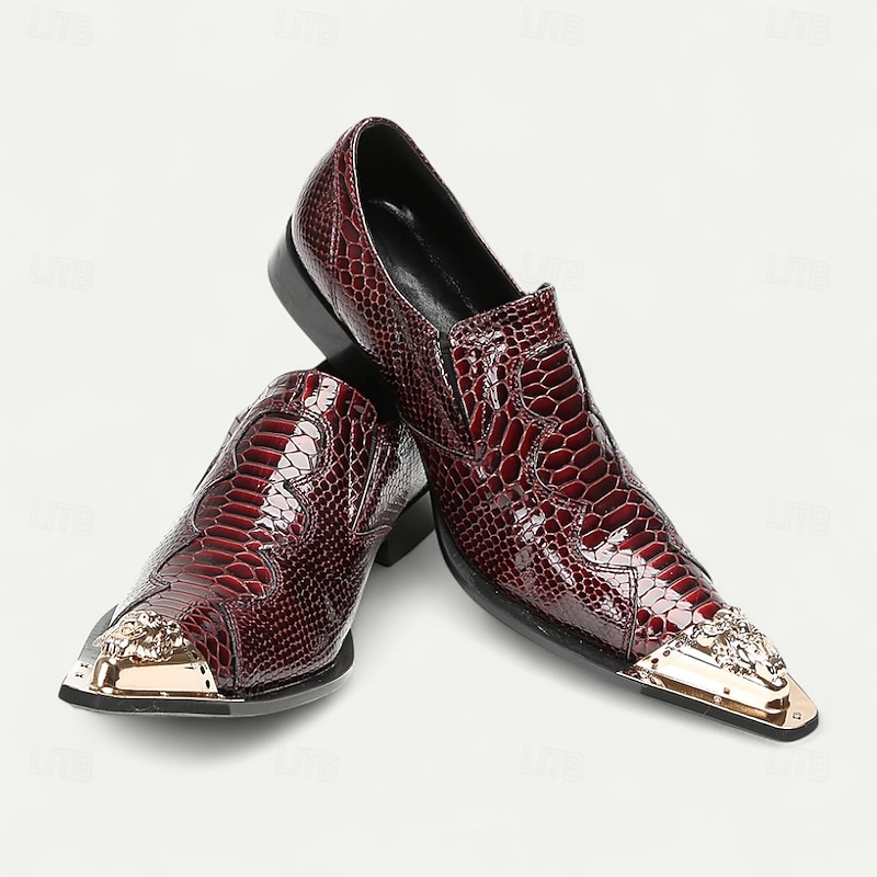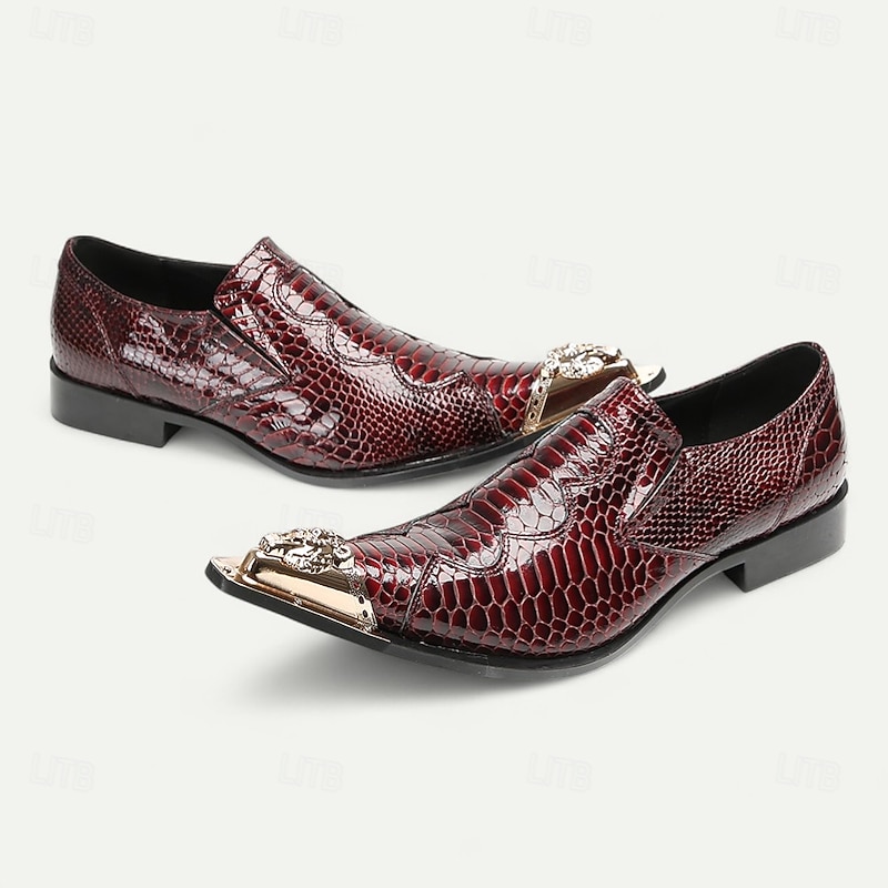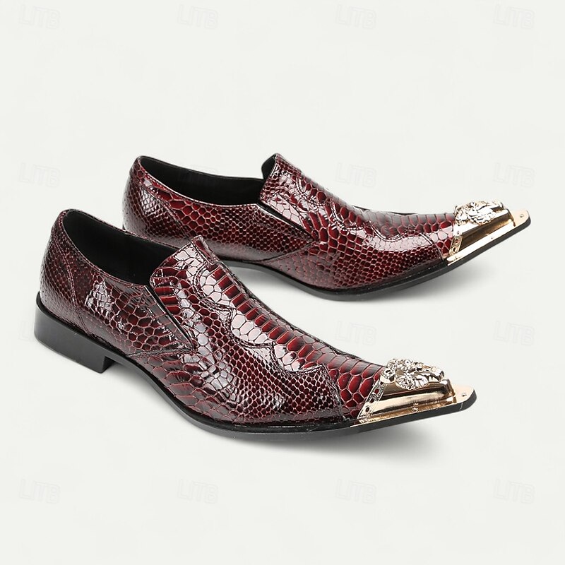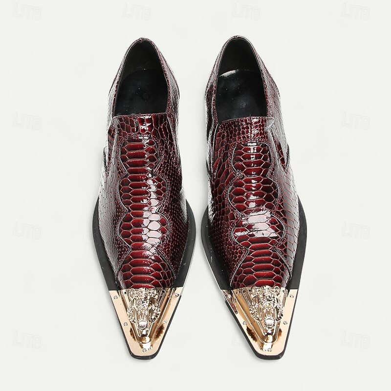 Why Choose Men's Burgundy Crocodile Pattern Leather Dress Shoes with Metal Pointed Toe, Elegant Slip-On Loafers for Banquets, Business Events and Special Occasions?