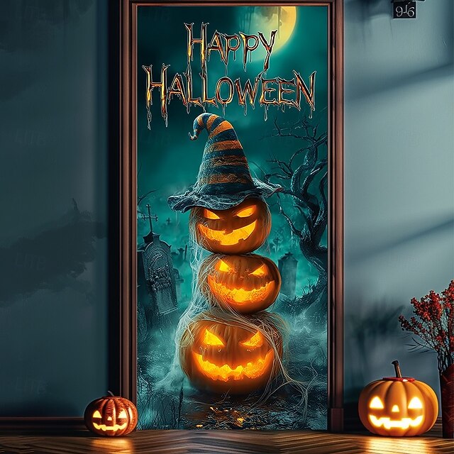 $18.99 - Halloween Door Cover – Stacked Pumpkins with Witch Hat and "Happy Halloween" Sign, Haunted House Entrance Banner, Outdoor 2025 Halloween Decoration for Bedroom, Living Room, Bathroom 2025. Shop for cheap Halloween Door Covers online? Buy at lightinthebox.com on sale today!