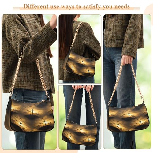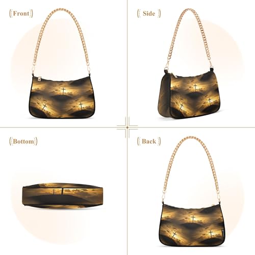 Zipper Ladies Shoulder Bag Sunset Clouds Crucifix Golden Medium Handbag Tote Artistic Womens Small Hobo Purse with Chain Strap