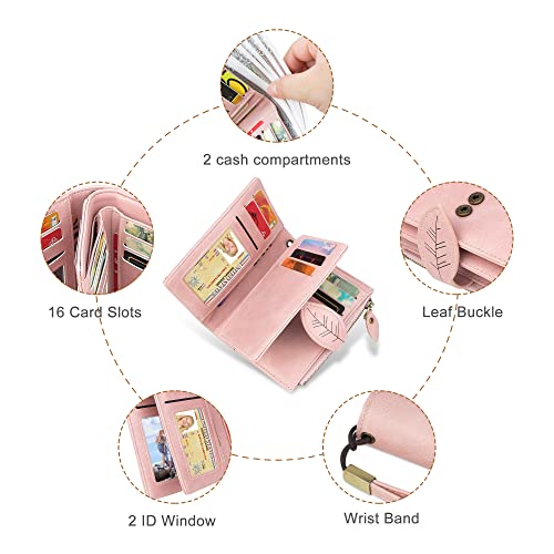Brand: CONISYColor: PinkMaterial: Faux LeatherStyle: ModernPattern: Solid❀ Small But Roomy - This women's wallets has 16 Card Slots, 2 ID Windows, 2 Long Cash Compartments, 1 Zipper Coin Purse. Roomy enough for fitting plenty of credit cards, cash, coins, bills, ID cards, driving licenses or family photos, keep them well organized.❀ RFID Wallets for Women - You can take this rfid blocking wallets for women everywhere such as bus stops, subway stations, supermarkets, outdoor activities and other occasions.Perfect to protect your credit card, Debit cards, traffic card, Smartcards, driver's license card etc.❀ Practical and Convenient - This wristlet wallets for women with a detachable wristlet strap, it allows you to easily carry it in hand or put it in bag. Strap as a wristlet when you need hands free, such as travelling, shopping.❀ modern Ladies Wallet - This womens wristlet wallets is made of top-grade PU vegan leather, Glossy, softer, more tear-resistant and comfortable to use. Elegant unique design with a stylish look that never goes out of fashion.❀ Trendy and Convenient - 4.96 x 3.94 x 1.18 inches, this womens small wallet is compact and practical, which makes it ideal for everyday carry, can be easily put into your coat pocket, handbag, crossbody bag or backpack. Perfect for everyday use. High quality materials and excellent craftsmanship ensure long-lasting durability.