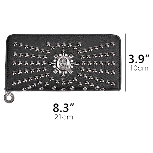 Studded Skull Wallet for Women, Black Gothic Clutch with Metal Studs, Zip-Around Compact Leather Purse for Cards and Cash