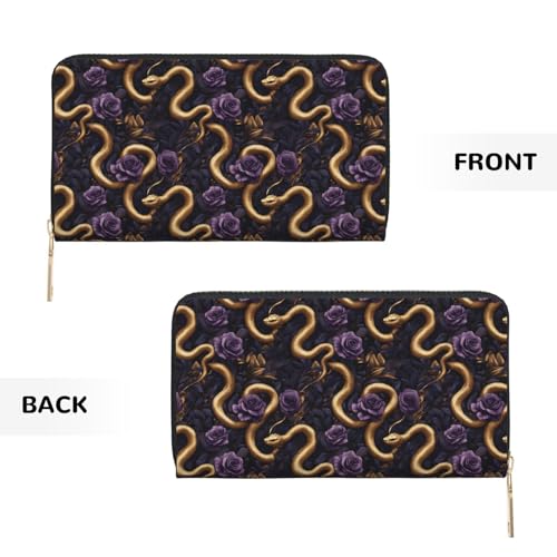 Leather Thin Slim Wallets for Women Men - Fashion Purple Rose Gold Snake Print Card Wallet Holder with Zipper