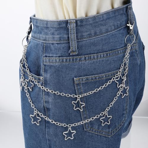 Xindojuz 2 PCS Star Belt, Silver Waist Chain Belt Adjustable Western Metal Jeans Pants Pocket Punk Hip Hop Wallet Chains for Women Men Body Belly Chain Goth Y2K Accessories