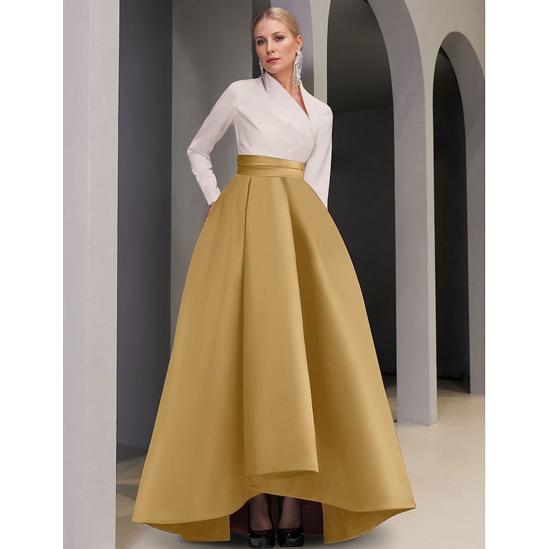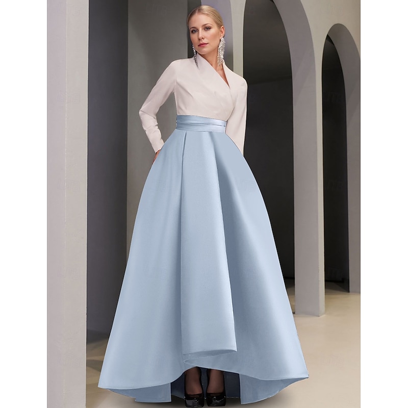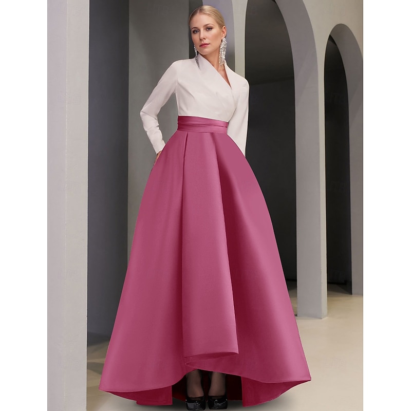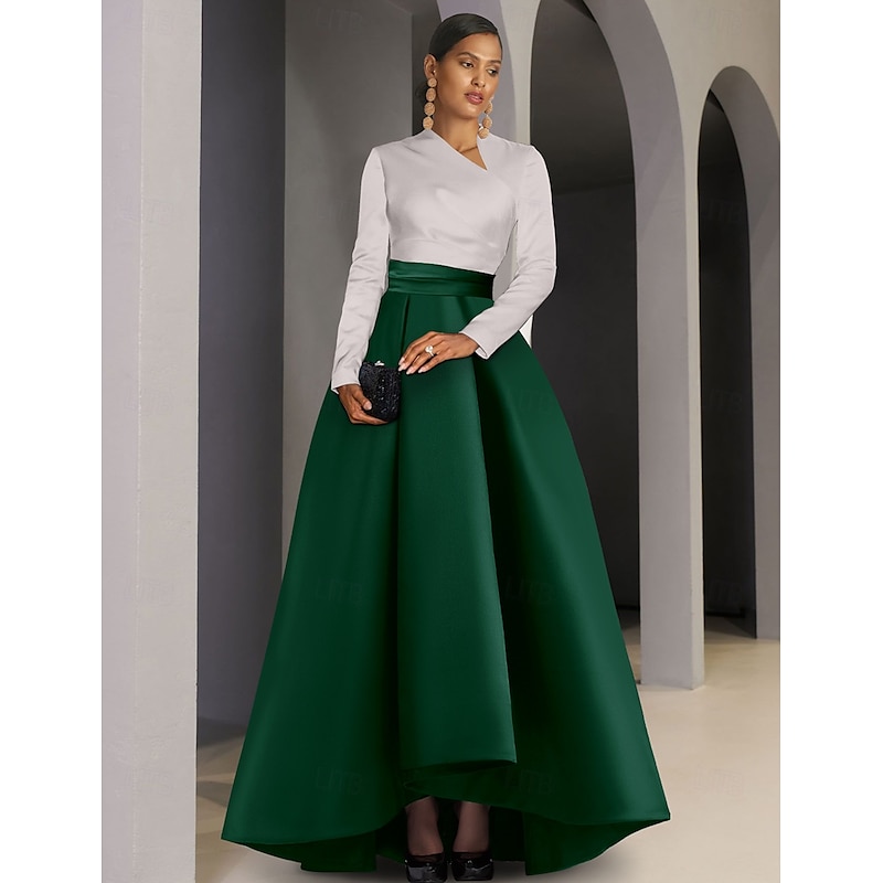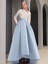 More information about Black Tie A-Line Evening Gown Elegant Dress Formal Wedding Guest Asymmetrical Long Sleeve V Neck Pocket Satin with Pocket