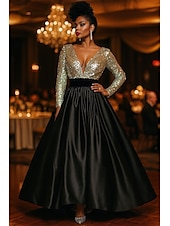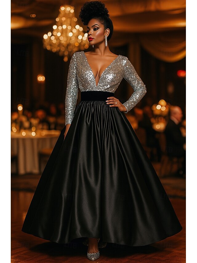 Black Tie A-Line Evening Gown Cocktail Dresses Sparkle Stretch Sequin Formal Gown Wedding Floor Length Long Sleeve Plunge Neckline Satin with Ruched 1