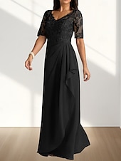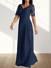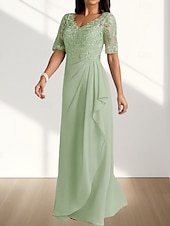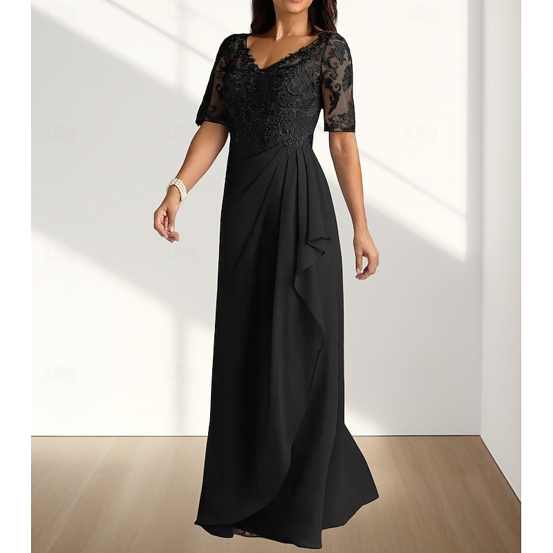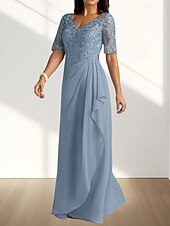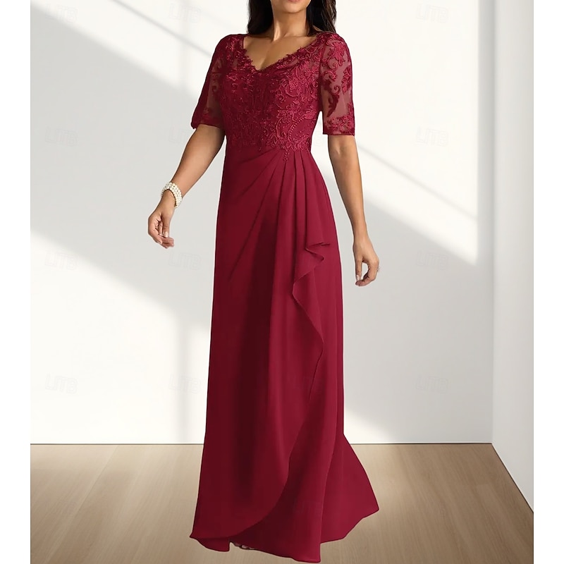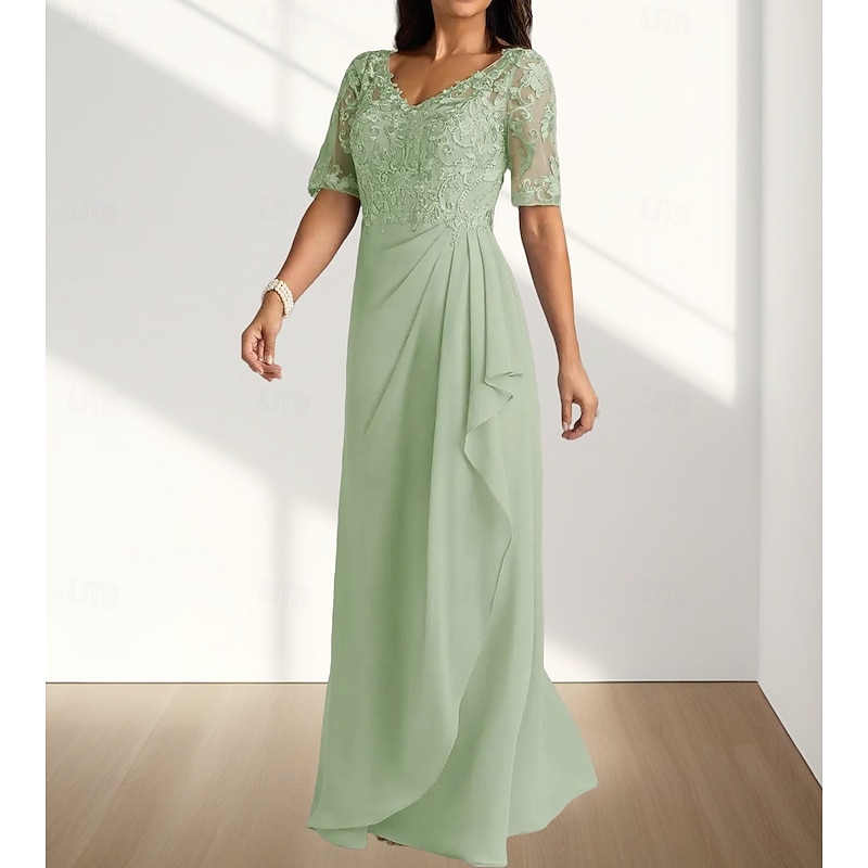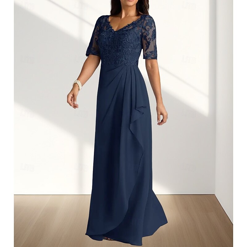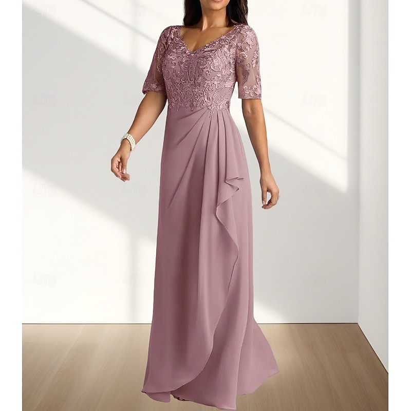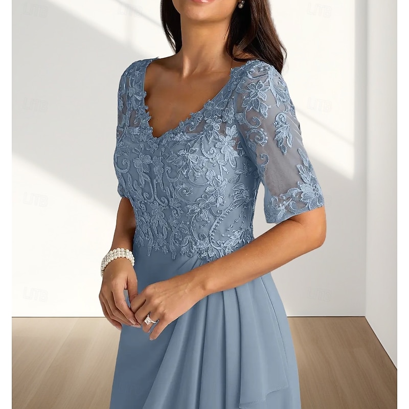 More information about A-Line Mother of the Bride Dress Wedding Guest Elegant V Neck Floor Length Chiffon Half Sleeve with Pleats Appliques