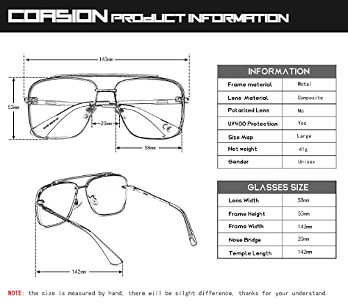 Origin: ImportedSquare shaped aviator sunglasses for that vintage style. Some things never seem to go out of style, and aviator sunglasses are living proof of that. Land that traditional look with our iconic aviator sunglassesThese COASION's retro vintage square sunglasses are made of high-quality metal materials and reinforced metal hinges that are sturdy enough for long time usingThey are suitable for both men and women and are suitable for any climate and weather conditions, and are suitable as a high fashion accessory and daily wear all year roundThese COASION sunglasses are the perfect choice for outdoor sports and activities such as driving, shopping, travelingLens Width: 58 mm, Frame Height: 53 mm, Nose Bridge: 20 mm, Frame Width: 143 mm, Arm Length: 142 mm, Net Weight: 41 g Perfect for everyday use. excellent materials and excellent craftsmanship ensure long-lasting durability.