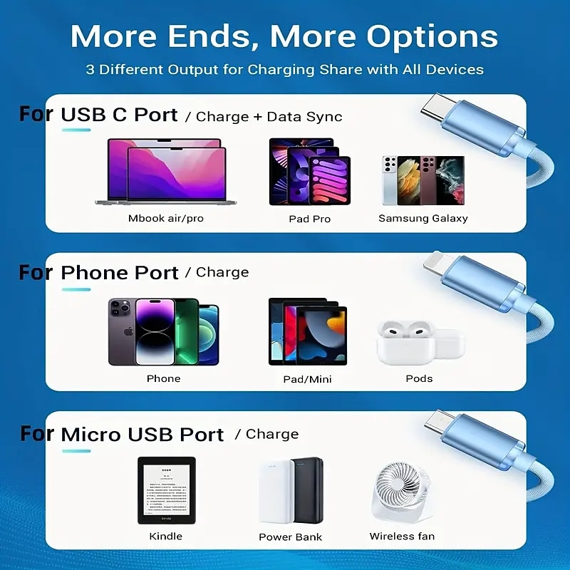 Why Choose 3 In 1 Design For Mac 120W USB C Multi speedy Charging Cable 3in1 Multiple Phone Charger Cable USB C Multi Cable With Type C/Micro USB/IP For Samsung S23 S22 S21 For IPhone 14 13 12 11 X XS 8 7 Pad?