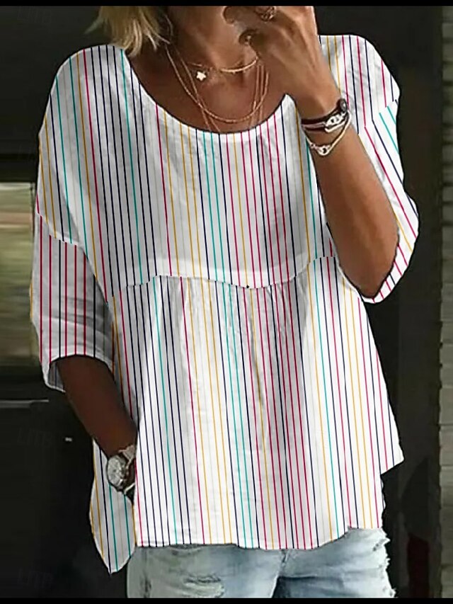 This Women's Blouse Striped trendy 3/4 Length Sleeve Crew Neck Regular Tops Daily Holiday Print White Blue Green Rainbow Summer combines elegant design with practical functionality. Every detail has been carefully considered to ensure you get the best possible experience. The superior construction means this product will serve you well for years to come.