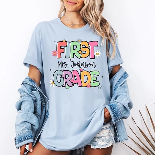 • Custom First Grade Teacher Shirt – Add your name to create a fun, personalized T-shirt faultless for welcoming your first graders with style.