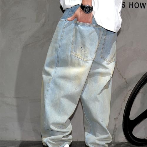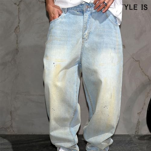 Men’S Streetwear Paint Point Baggy Denim Cargo Pants Slim Fit Full Length Button Fly Midweight Light Wash Trousers