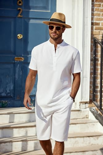 COOFANDY Men's 2 Pieces Linen Set Casual Henley Shirts Short Sleeve Beach Yoga Shorts Summer Pants Outfits