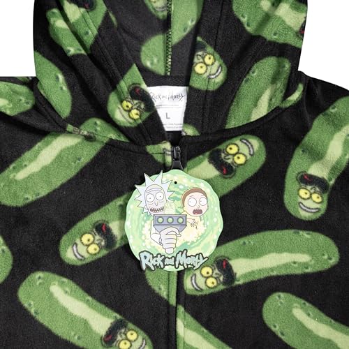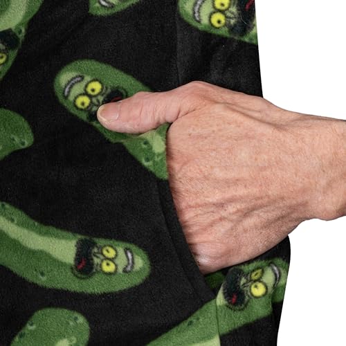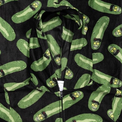 Fabric type: 100% PolyesterCare instructions: Machine WashOrigin: Made in the USA or ImportedOfficially Licensed Pickle Rick pajama union suit, featuring a vibrant black and green design inspired by the iconic Rick and Morty episode.Made for all, this unisex pajama set is crafted from soft, breathable fabric ensuring a cozy fit for everyone, whether lounging or channeling your inner Pickle Rick.Equipped with a convenient zipper, and a hood transitioning from your daily gear to this fan-favorite outfit is as easy as saying I'm Pickle Rick! Ideal for relaxed evenings.Embrace the spirit of adventure with detailed graphics that stay true to the beloved show's aesthetics. A must-have for collectors and casual fans alike.Carefully designed to balance warmth and comfort, making it the ultimate choice for sleepwear or a special costume at gatherings among fellow enthusiasts. Perfect for everyday use. excellent materials and excellent craftsmanship ensure long-lasting durability.