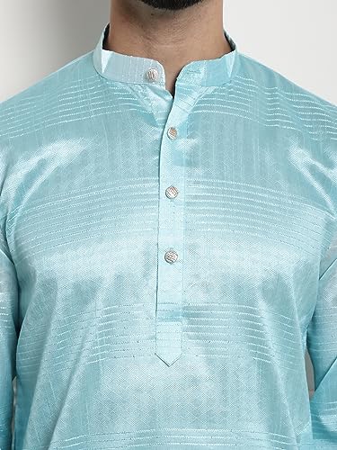 Fabric type: Kurta : Jacquard Silk ( 80% Silk , 20% Cotton ), Bottom : 100% CottonCare instructions: Machine WashOrigin: ImportedElegant designer kurta in jacquard silk blend with 80% silk and 20% cotton.Full sleeves and mandarin collar add a touch of sophistication.Regular/comfort fit ensures ease and style for any occasion.Knee-length kurta pairs with a solid 100% cotton pyjama for a traditional look.Refer to the chest size in the size chart for a superb fit.