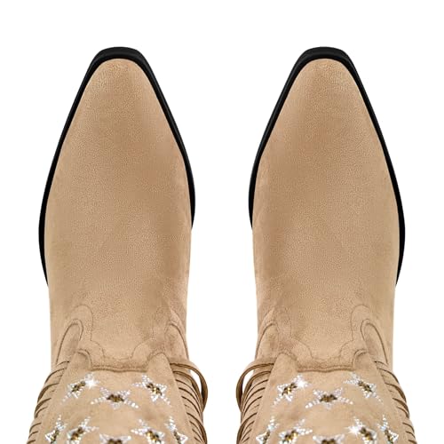 richealnini Mid Calf Fringe Cowboy Boots Glitter Rhinestone Western Cowgirl Boots with Tassel Pull On Stacked Heels Prom Wedding Shoes Dressy