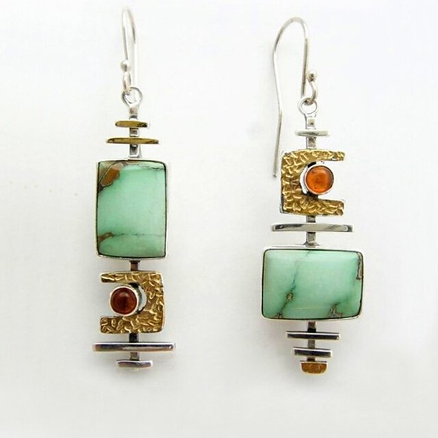 : Crafted from a blend of high-quality alloy, these earrings feature a textured design with geometric elements that are both durable and lightweight. The primary attraction is the natural rectangular turquoise stone that displays a vivid green hue with hints of brown veining, providing an earthy, organic feel.